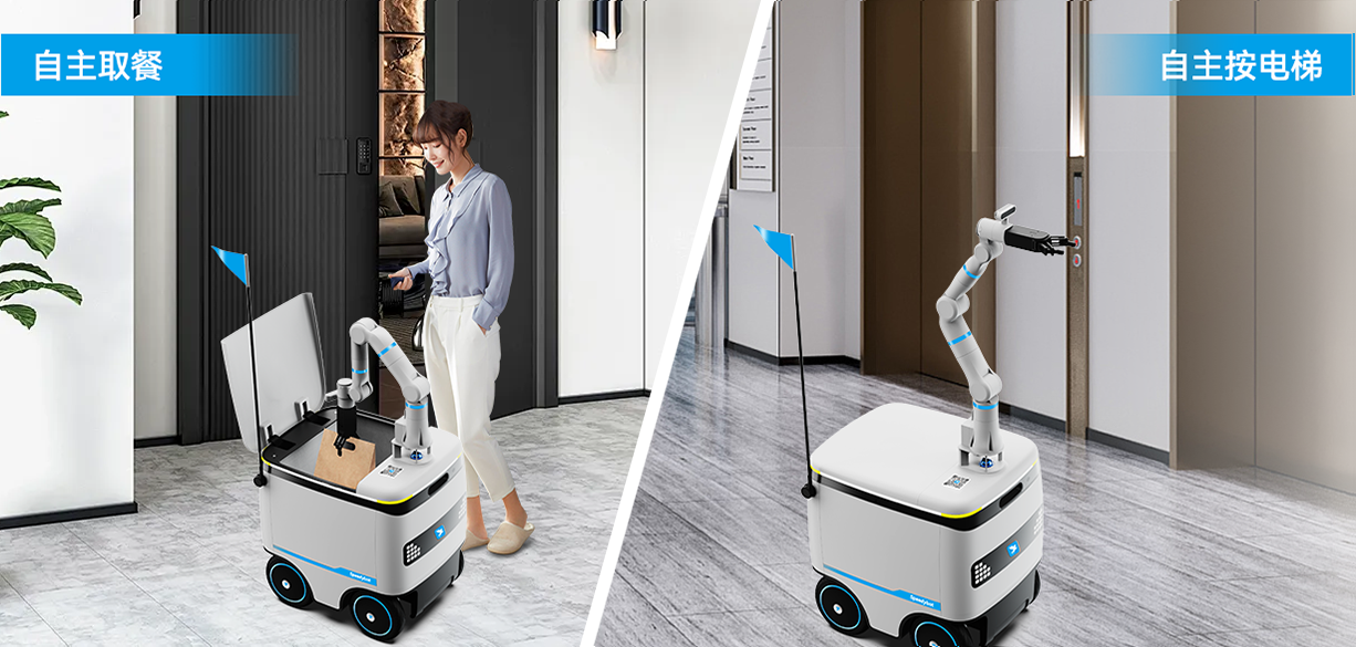 通过AI视觉识别自主按电梯、敲门、拿取外卖物品等,灵活配送、节省人效,并且安装视觉模块,使用更放心。